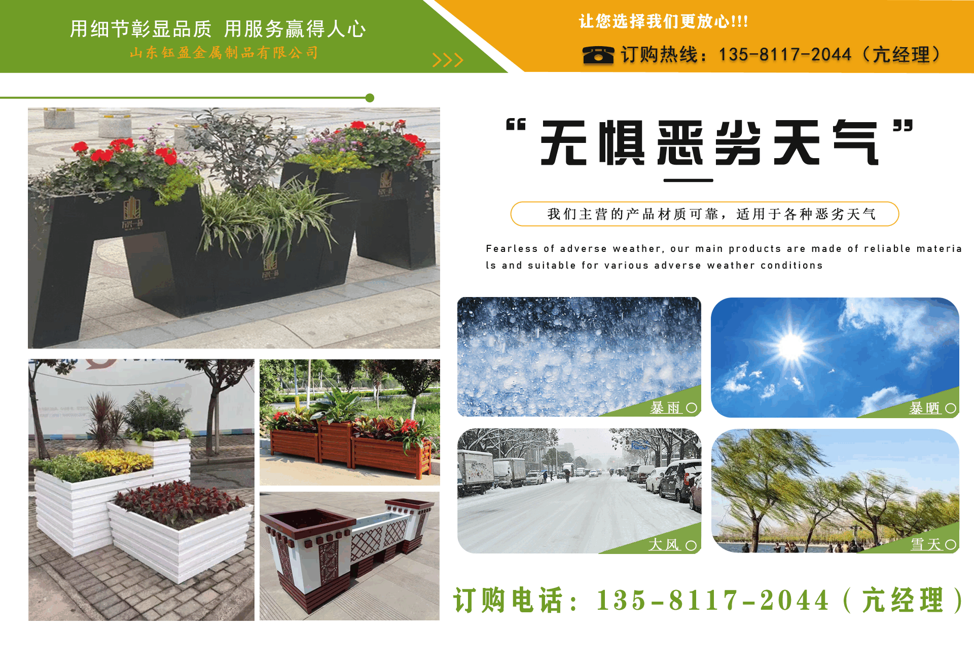 山東鈺盈金屬制品有限公司主營鍍鋅板花箱,道路隔斷花箱,定制花箱,戶外道路花箱,花箱座椅等產(chǎn)品,產(chǎn)品結(jié)構(gòu)合理、性能優(yōu)良,具有強(qiáng)度高、耐腐蝕、抗老化、隔熱隔音、節(jié)約能源、外形美觀、使用壽命長等優(yōu)點,深受國內(nèi)外客戶認(rèn)可。 我們根據(jù)客戶所在城市的文化特征,制造出符合當(dāng)?shù)爻鞘形幕瘹庀⒌淖匀涣Ⅲw、觀賞性強(qiáng)的花箱產(chǎn)品成為城市里一道靚麗的風(fēng)景線。 公司實行誠實、公正、守信、價格合理、平等互利。 公司憑借雄厚經(jīng)驗實力,恪守誠信為本的原則,得到了眾多客戶的信賴,并在業(yè)界獲得良好的口碑。建立了穩(wěn)固的合作關(guān)系,隨著業(yè)務(wù)的不斷發(fā)展和壯大,合作伙伴的范圍也在不斷擴(kuò)大。我們熱情盼望與您的合作,為社會的可持續(xù)發(fā)展獻(xiàn)上一份努力。...